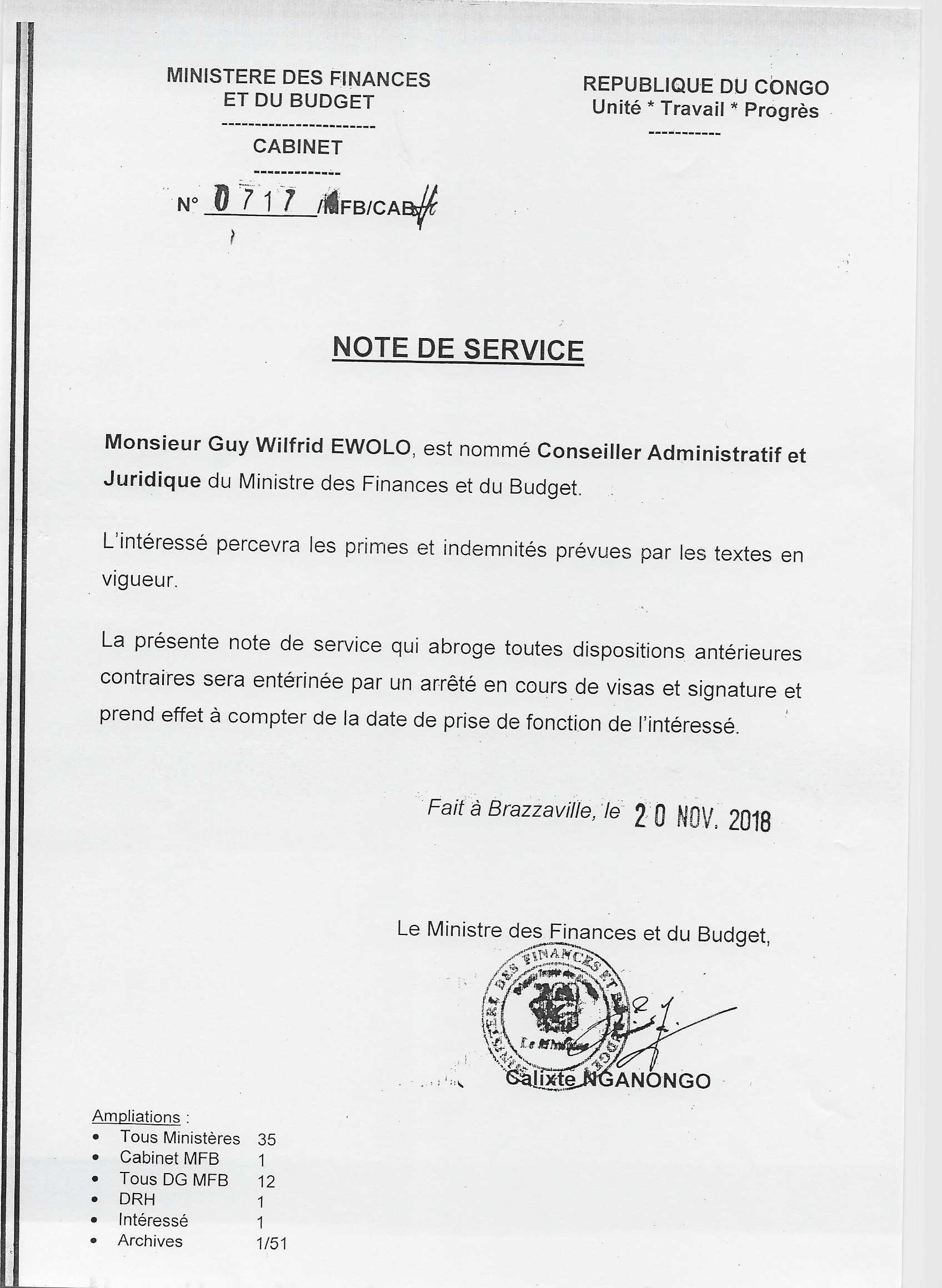 Note de service n°0717/MFB-CAB relative à la nomination du Conseiller administratif et juridique