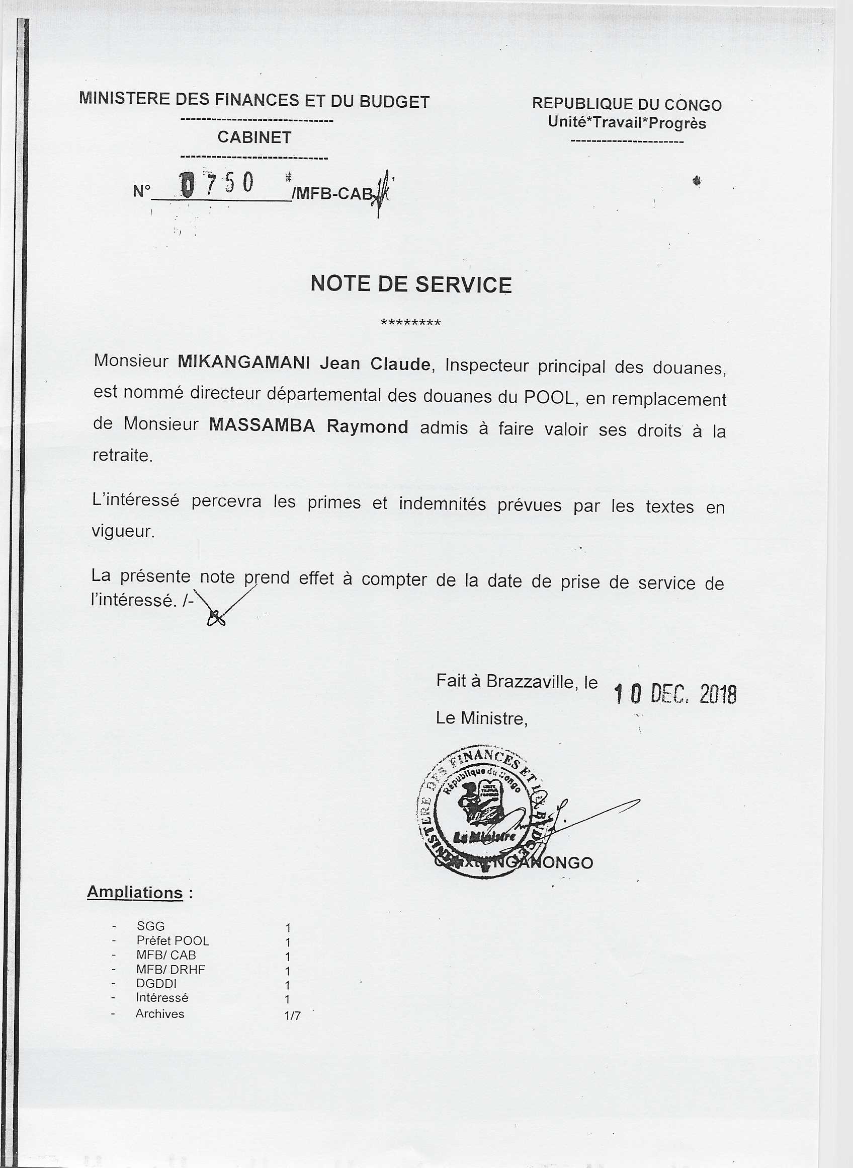 Note de service n°0750/MFB-CAB relative à la nomination du Directeur départemental des douanes du Pool