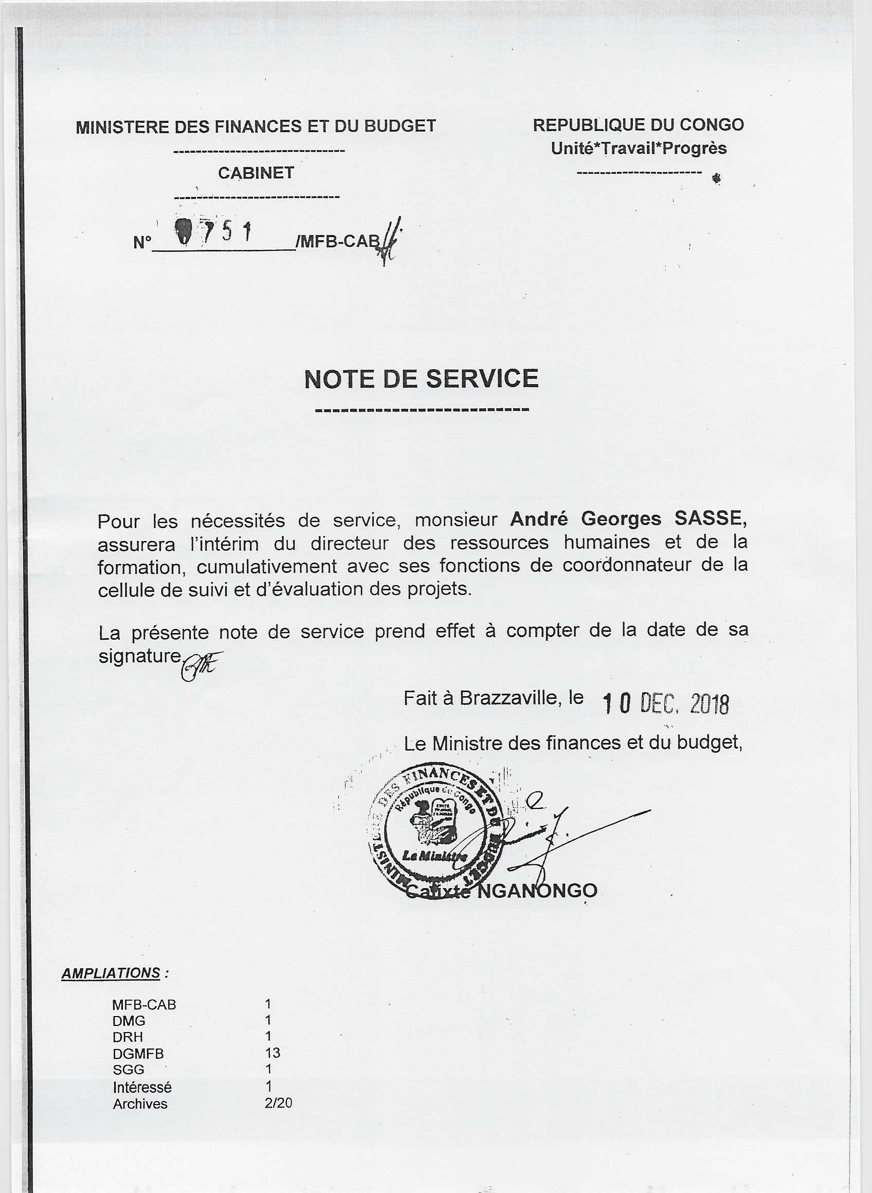 > Note de service n°0751/MFB-CAB relative à l'intérim de la Direction des ressources humaines