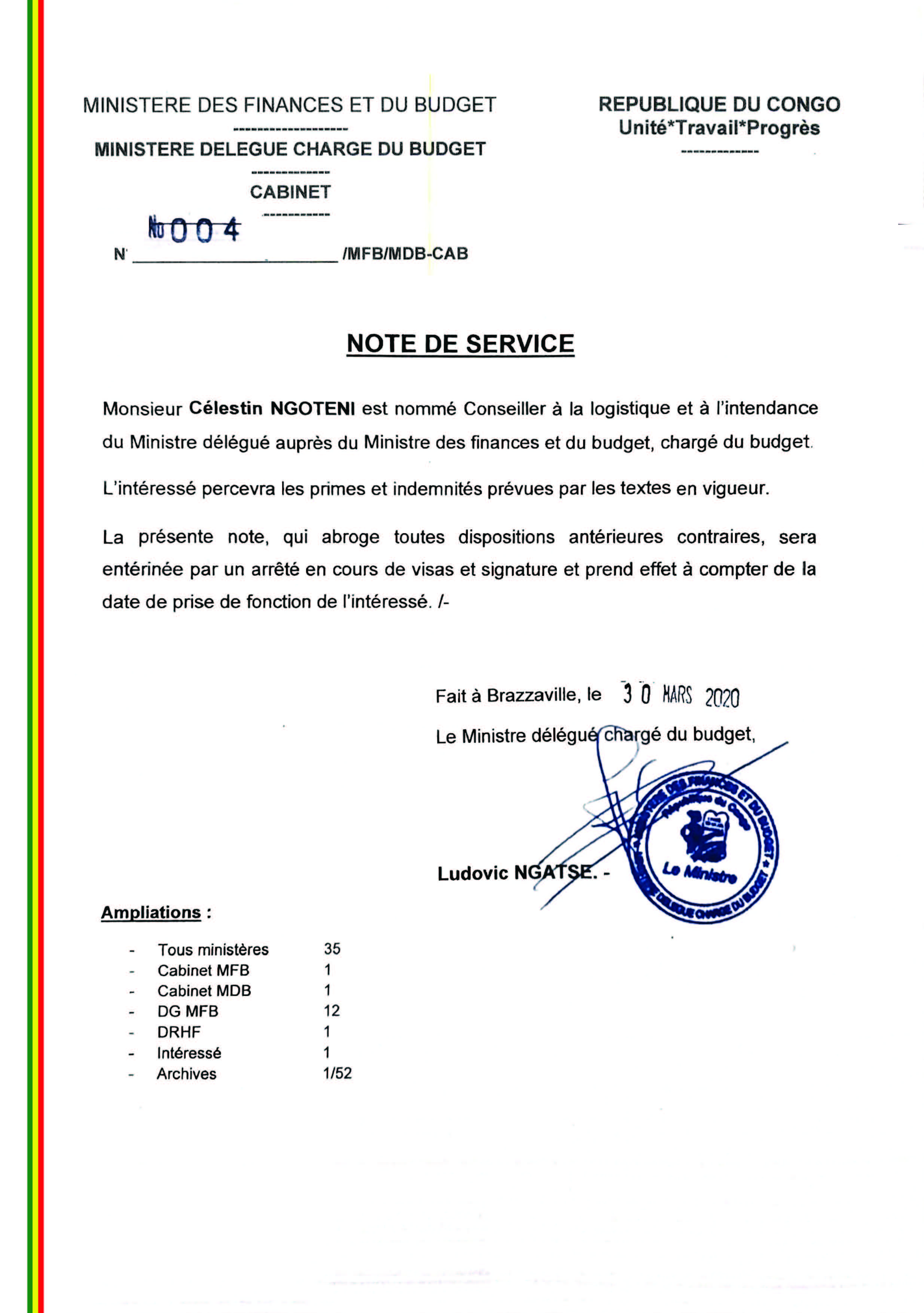 Note de service n°004/MFB/MDB-CAB relative à la nomination du Conseiller à la logistique et à l'intendance du Ministre délégué