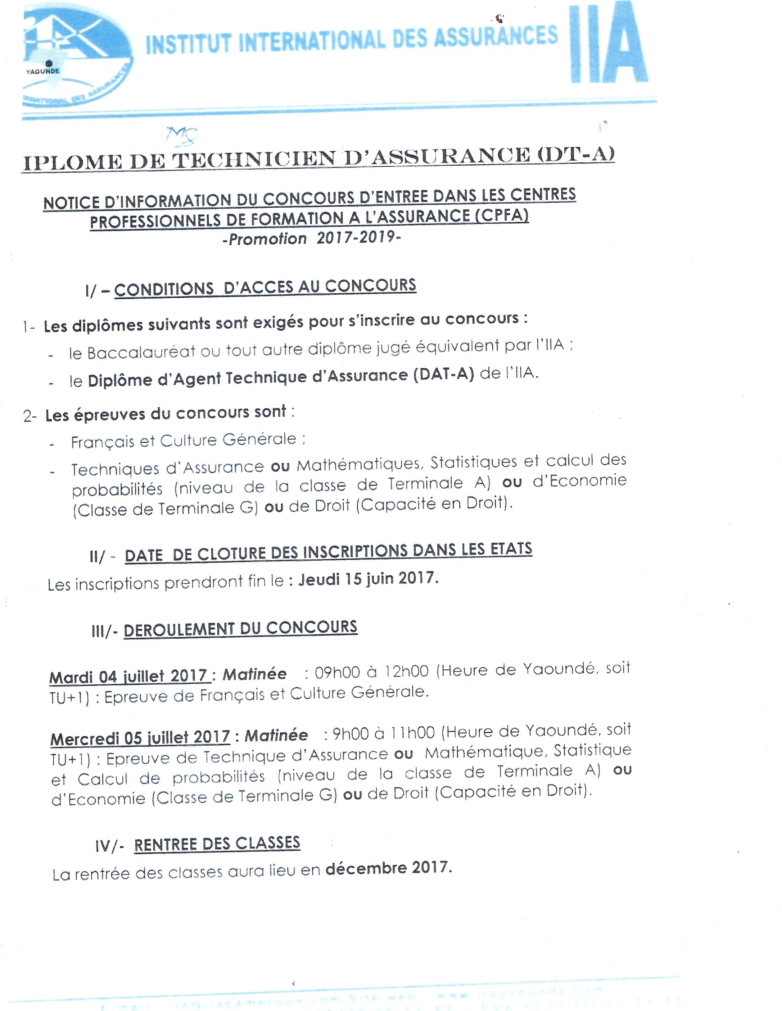 > Notice d'information sur le concours d'entrée au Centre de Professionnels de Formation à l'Assurance (CPFA)