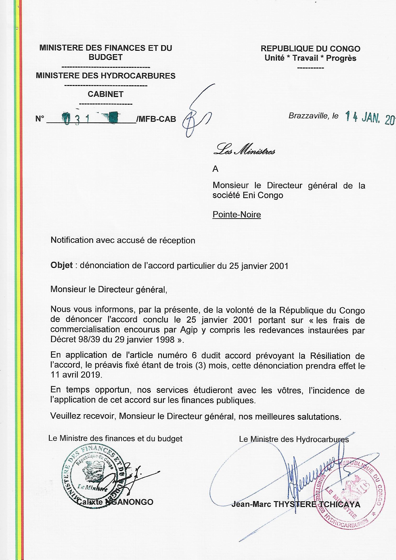 > Notification des Ministres des finances et du budget, et des hydrocarbures, au Directeur général de la société ENI Congo