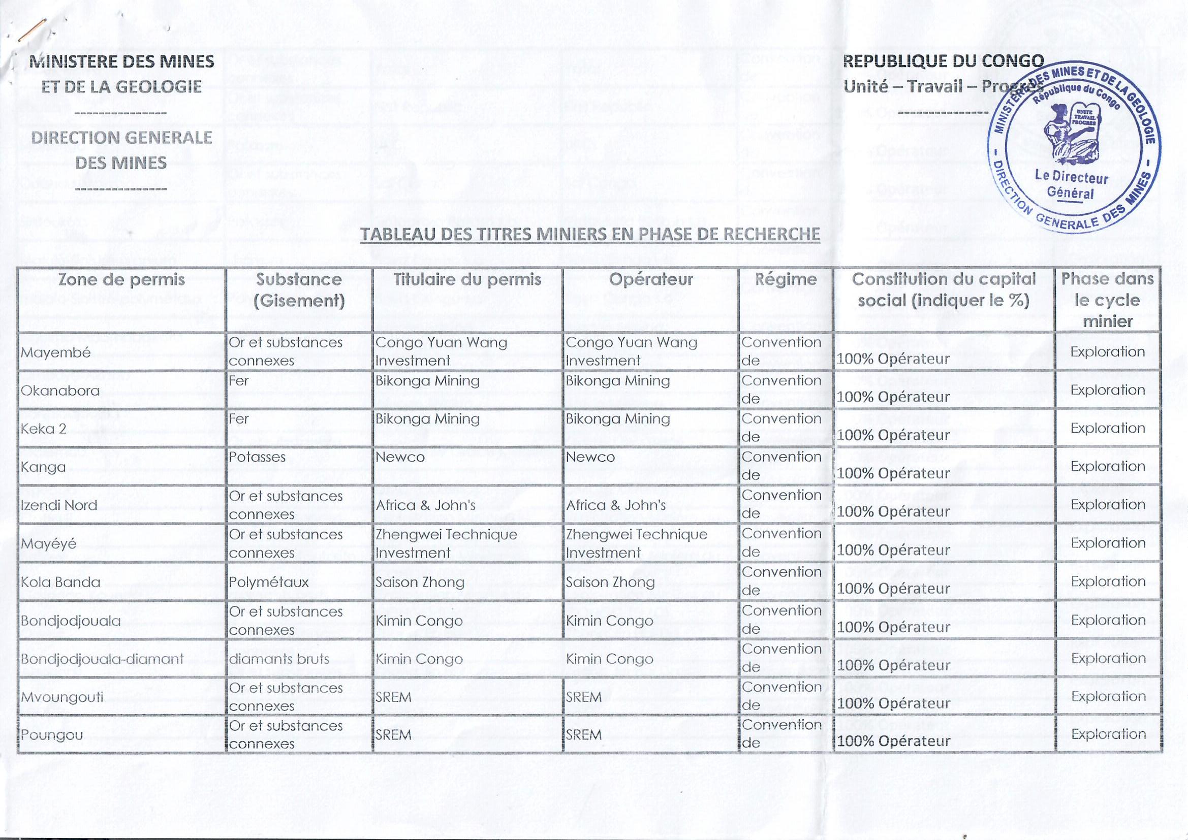 > Tableau des titres miniers en phase de recherche